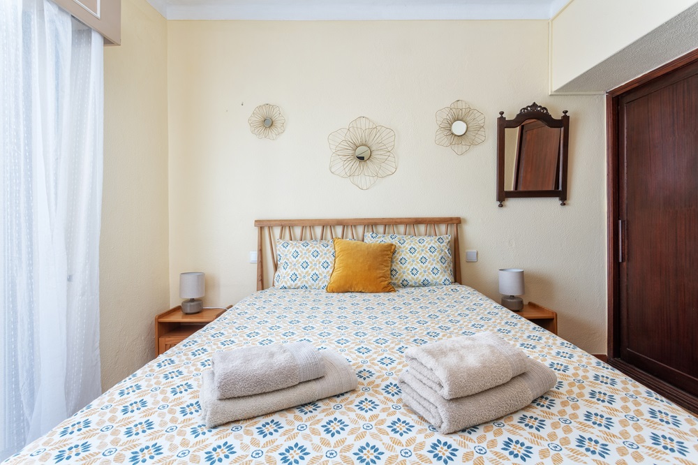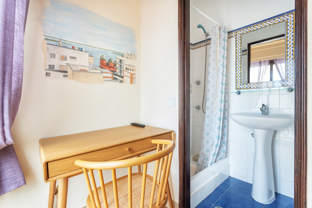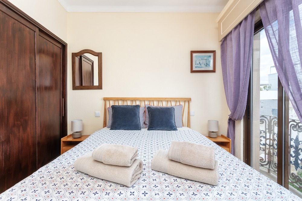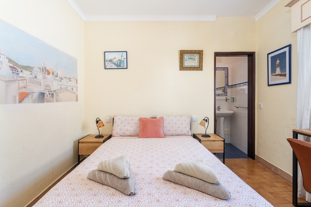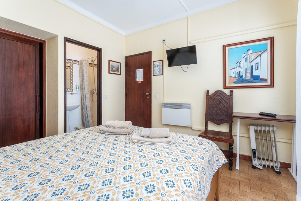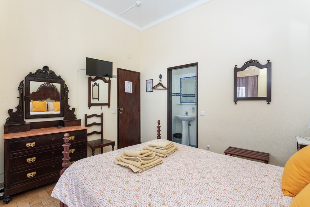 “Olhão” is on the 1st floor with a French balcony, has one double bed with shower/basin in the room and shared toilets on each floor.
